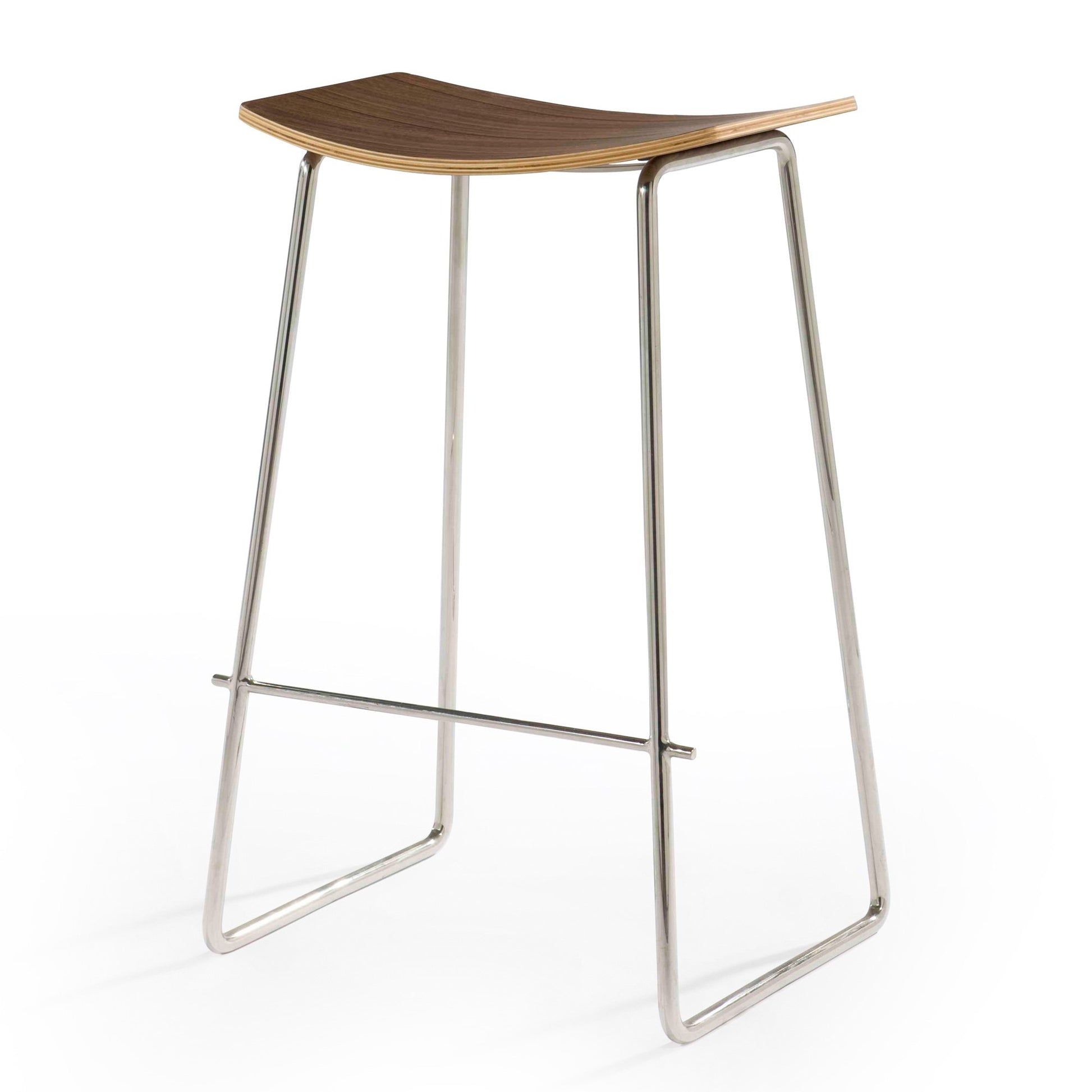 Aeon Furniture's Timber Counter Stool boast a concave seat in a classic American Walnut veneer finish that upon a slender sleek base constructed from durable polished steel. The built-in footrest adds to the comfort of this piece while complementing the impeccable minimalist design.