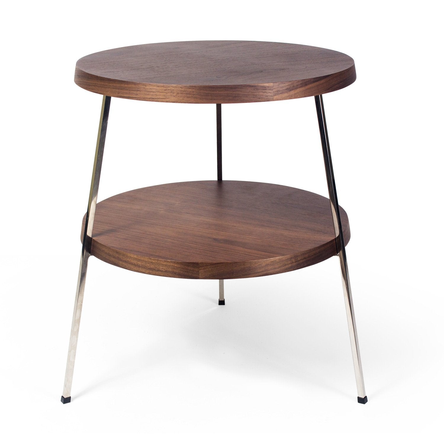Two-Top side table is an original Sean Dix design expertly crafted from the finest materials by true furniture artisans. Boasting a walnut veneer top and shelf, supported by three thin yet sturdy polished stainless steel legs, this table works equally as well in your living room or as a bedside table.