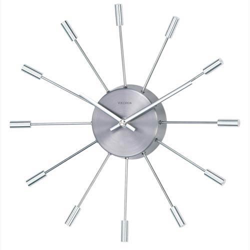 A polished metal center is surrounded by twelve shining aluminum tubes numbered one to twelve at each end. The minute hands complete the retro style. This is the Pill clock. Time is kept by a high quality Quartz movement (requiring only one AA battery; not included).